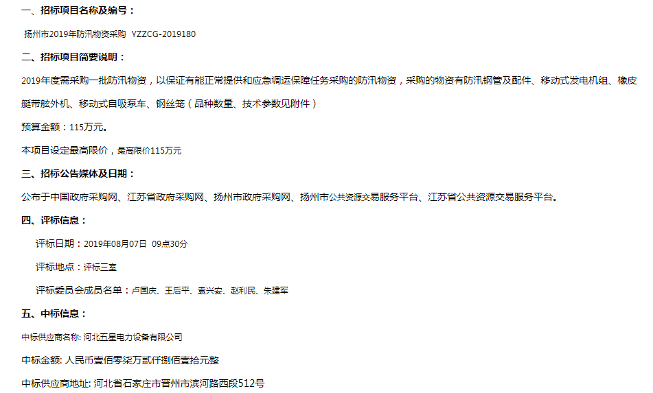 熱烈祝賀河北五星揚州市2019年防汛物資采購一舉中標(biāo)!